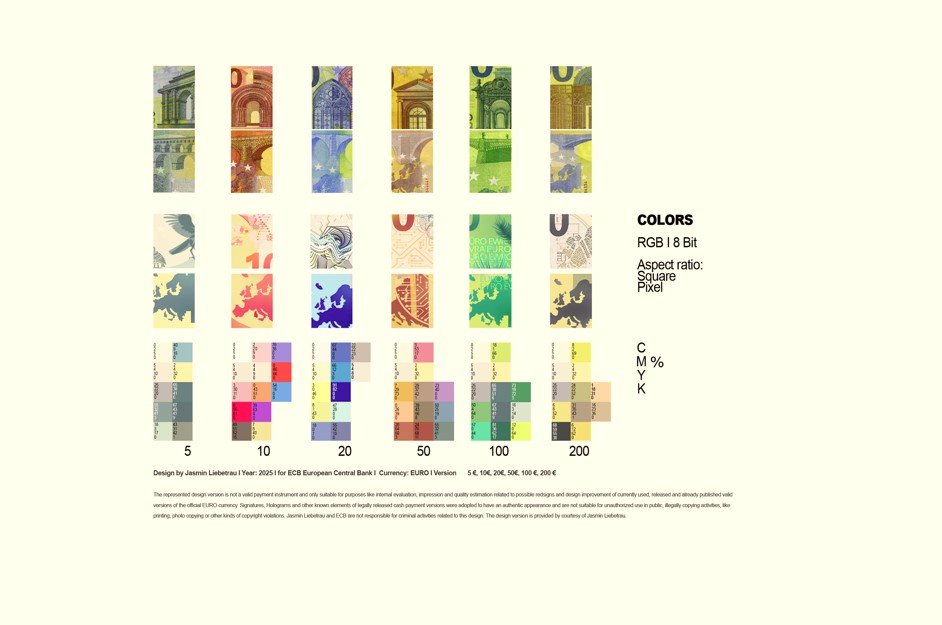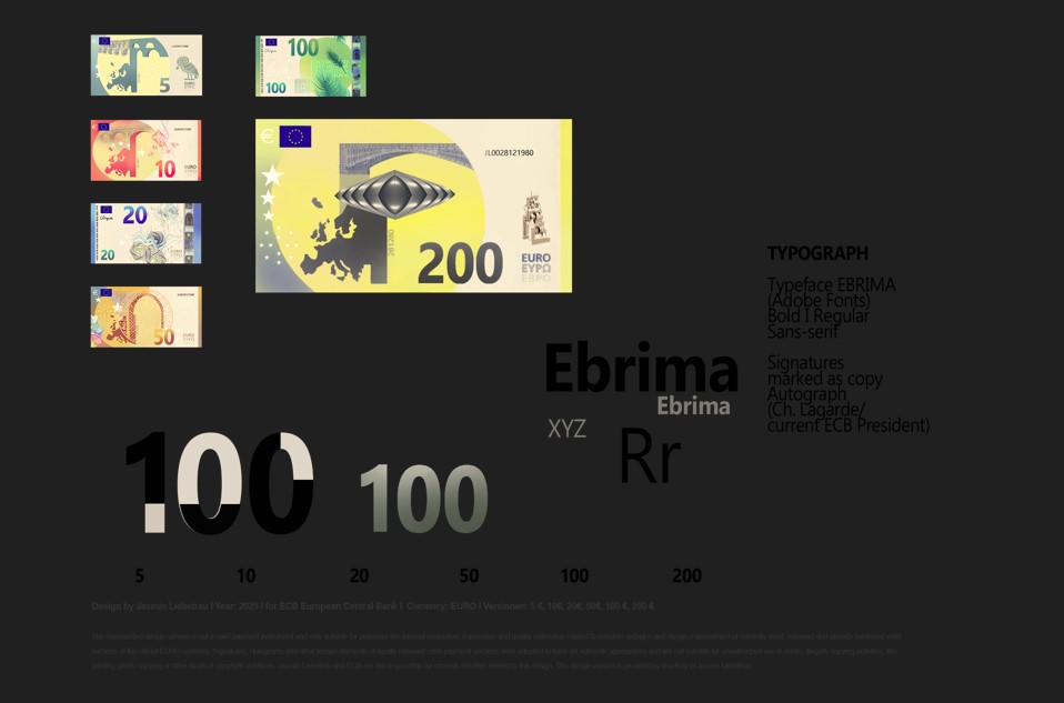 The represented design version is not a valid payment instrument and only suitable for purposes, like impression and showing possible design improvements and visual modifications of already/ currently used, released and published valid versions of the official EURO currency. Signatures, Holograms and other known elements of legally released cash payment versions were adapted to have an authentic appearance and are not suitable for unauthorized use in public, illegally copying activities, like printing, photo copying or other kinds of copyright violations. Jasmin Liebetrau and ECB are not responsible for criminal activities related to this design. [ Year 2025 ] ![]()